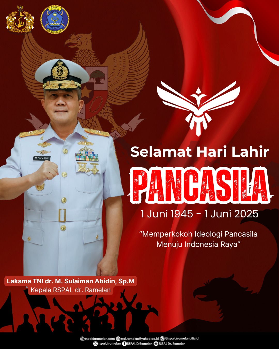 Kepala RSPAL dr. Ramelan Laksma TNI dr. M. Sulaiman Abidin, Sp.M, bertindak selaku Inspektur Upacara dalam Upacara Peringatan Hari Lahir Pancasila Tahun 2025, dengan Pasukan Upacara Prajurit, ASN, dan PHL RSPAL dr. Ramelan bertempat di Lapangan Apel RSPAL dr. Ramelan, Surabaya. Senin,(02/06/2025).