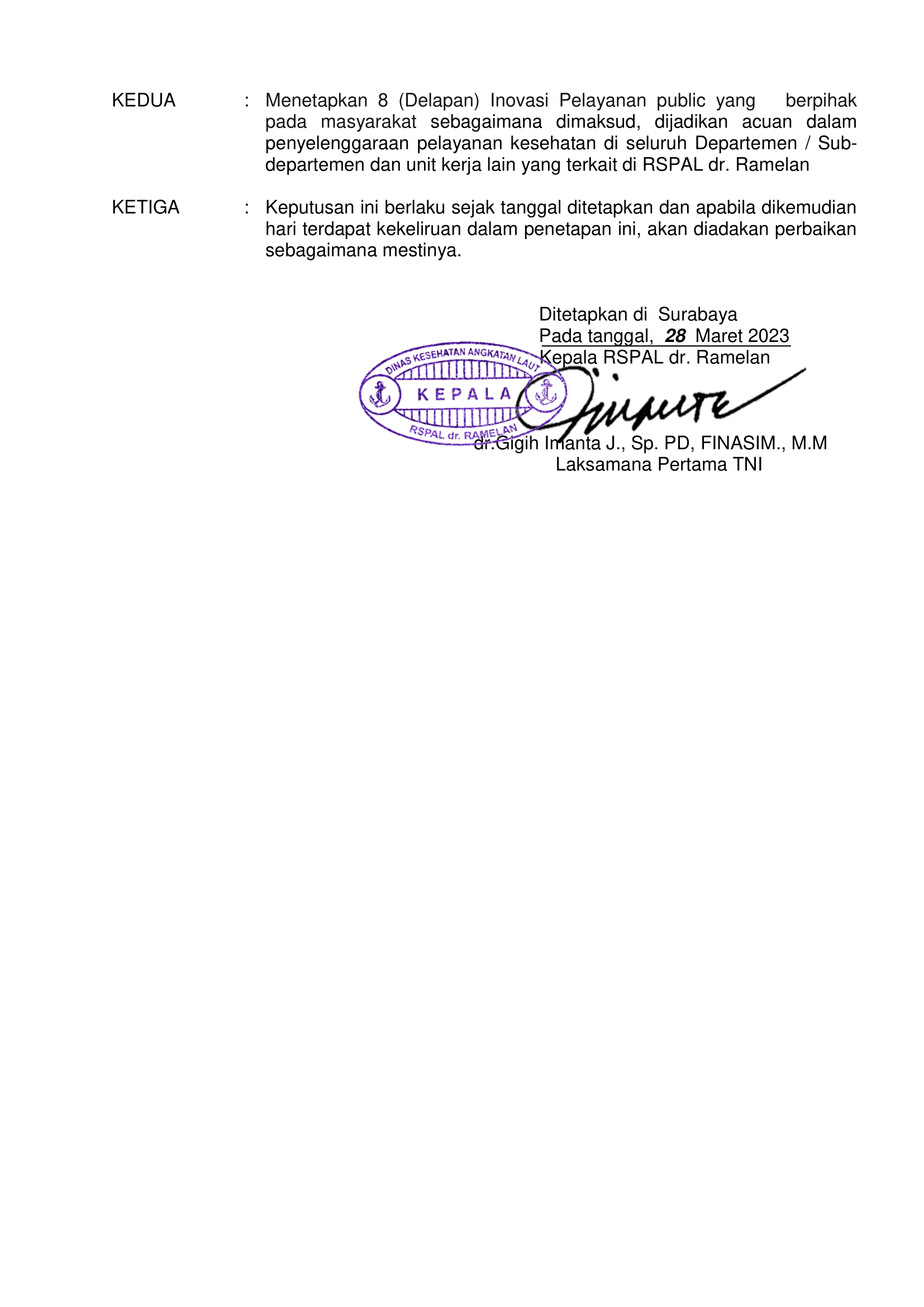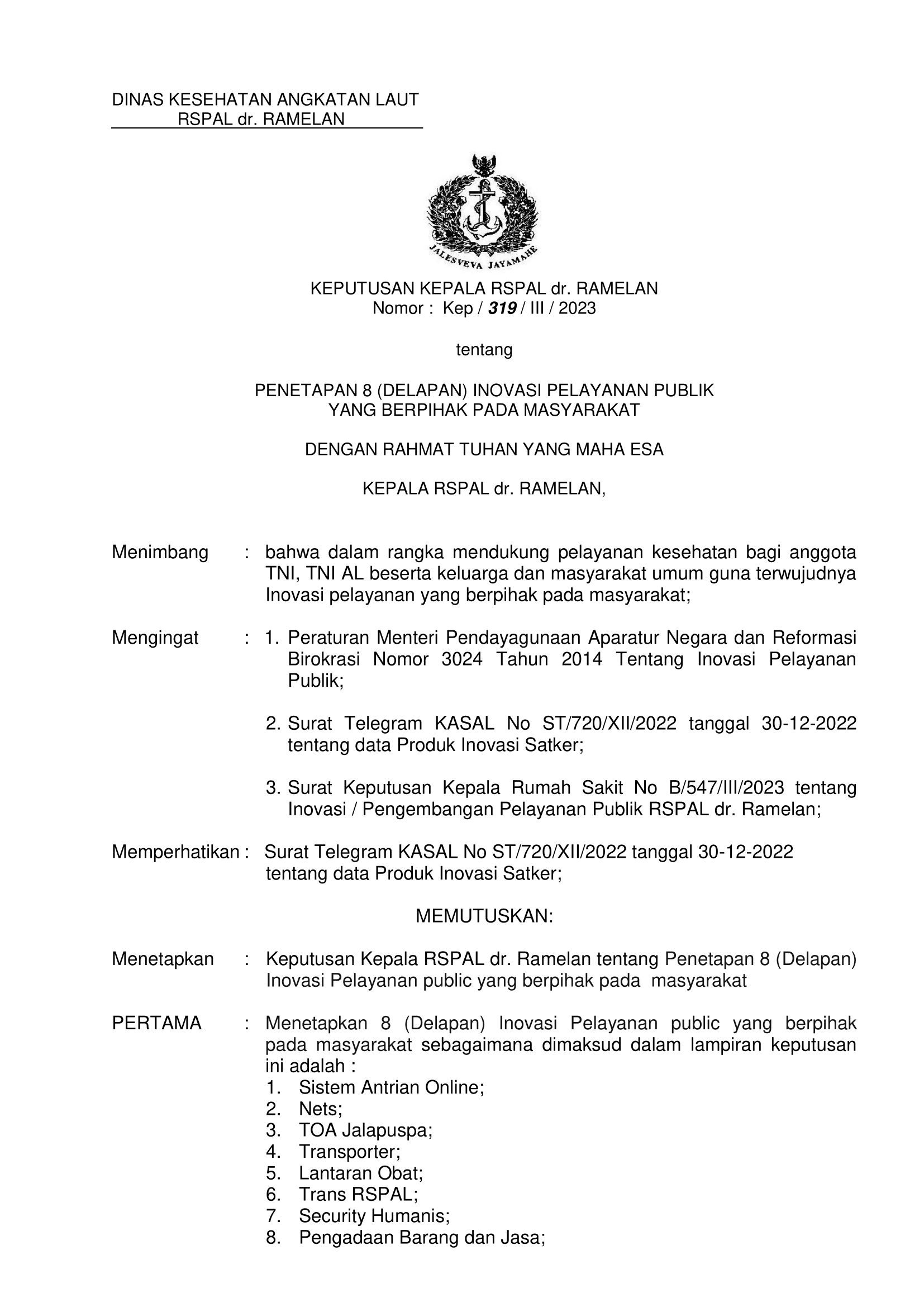 KEPUTUSAN KEPALA RSPAL dr. RAMELAN Nomor : Kep / 319 / III / 2023 tentang PENETAPAN 8 (DELAPAN) INOVASI PELAYANAN PUBLIK YANG BERPIHAK PADA MASYARAKAT