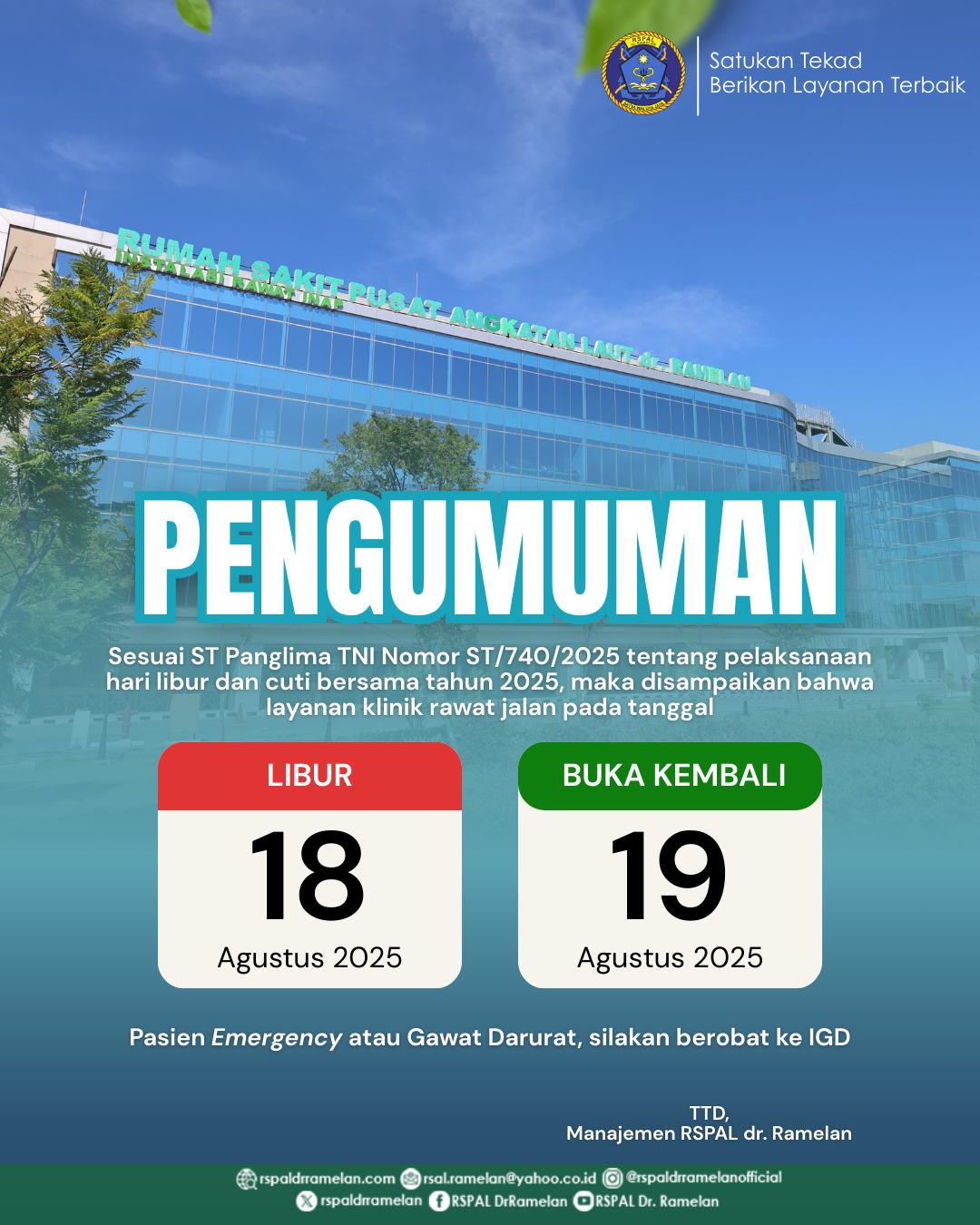 Wakamed RSPAL dr. Ramelan Kolonel Laut (K) dr. R. Yudadi, Sp.B-KBD mewakili Kepala RSPAL dr. Ramelan Laksma TNI dr. M. Sulaiman Abidin, Sp.M., memimpin Acara Pembukaan Pelatihan Code Stroke bagi seluruh Dokter Jaga IGD, Perawat IGD - Stroke Unit, Tenaga Pendukung RSPAL dr. Ramelan, bertempat di Ruan...
